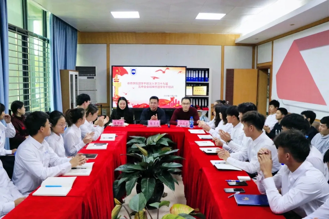 12月22日下午,必赢76net线路官网团学干部深入学习十九届五中全会精神会议暨团学骨干培训在联谊馆会议室举行。学院党总支陈卫东书记、学工办许达潭主任、兼职辅导员吴梦迪老师出席会议,院团学干部和2020级全体班委参加会议。