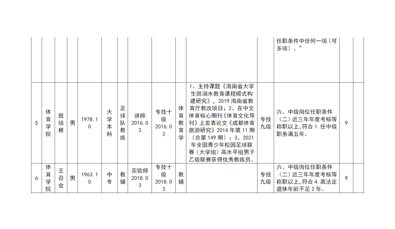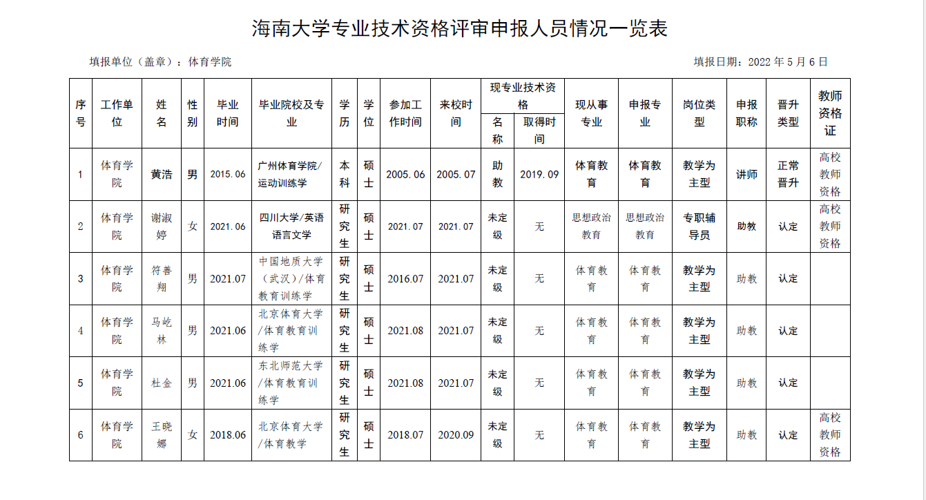 根据《海南省人力资源和社会保障厅关于我省事业单位岗位设置管理有关问题的通知》(琼人社发[2013]54号),《必赢76net线路官网岗位设置及聘用方案(修订)》(海大[2020]103号)等相关要求,由教职工本人申请,共有6名教师提出2022年度专业岗位聘用申请、10名教师提出专业技术评审和认定申请, 学院基层评审委员会审核,并票决全部通过。具体名单如下: