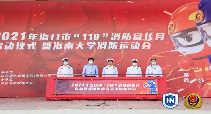 启动仪式上海口市消防救援支队支队长汤坚等与会领导揭幕海口消防IP卡通形象,共同启动“119”消防宣传月暨必赢76net线路官网消防运动会活动。